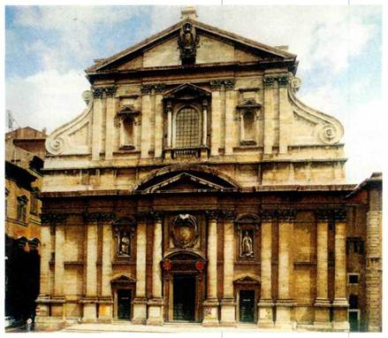 словно перетекает вниз. Это придаёт фасаду сложный и выразительный облик. Впоследствии такое оформление стало типичным для многих соборов и церквей в стиле барокко (позднее появился даже термин «иезуитский стиль», относящийся к этим постройкам).