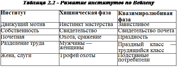 Веблен связывает развитие институтов с четырьмя фазами развития общества.