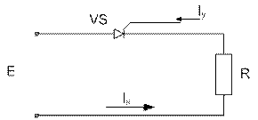 В схеме, содержащей источник питания Е, тиристор VS и резистор R (рис.1.2) возможны два устойчивых состояния, одно из которых соответствует открытому, а второе закрытому тиристору . Часть характеристики от нуля до точки А соответствует прямому току отключенного тиристора , а участок характеристики от точки А до точки Б соответствует прямому току открытого тиристора. Повышение напряжения источника от нуля до Е вызывает при IУ =0 перемещение рабочей точки по нижней ветви характеристики до точки А. Если теперь подать управляющий импульс тока с амплитудой IУ1 и с длительностью , достаточной для поддержания этого тока на время открывания тиристора , то рабочая точка перейдет скачком в положение Б, соответствующее открытому тиристору .