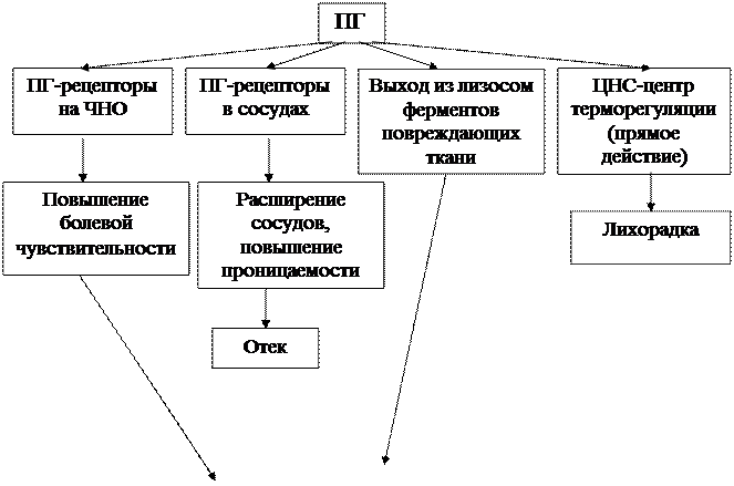а) ПГ воздействуют на болевые рецепторы, возбуждая их; повышают чувствительность болевых рецепторов к воздействию экзогенных и эндогенных (брадикинин, серотонин, гистамин) раздражителей;