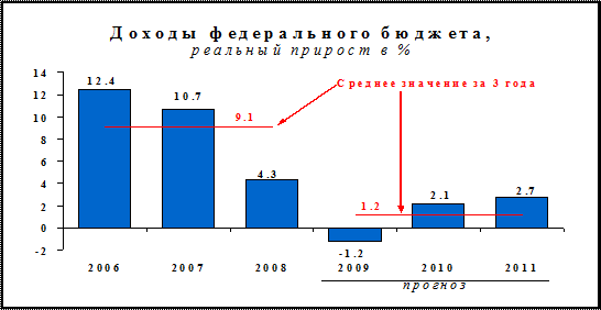 Доходы федерального бюджета в 2009 году составят 9158,3 млрд.рублей, что в реальном выражении на 1,2% ниже, чем в 2008 году. В целом за 2009-2011 доходы в реальном выражении возрастут на 3,6%, или на 1,2% в среднем за год. Для сравнения: в 2006-2008гг. среднегодовой размер роста доходов в реальном выражении составлял 9,1% (27,4% за период).