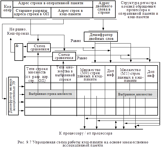 При обращении к кэш-памяти старшие разряды адреса строки оперативной памяти сравниваются с тегами на внешних схемах сравнения. При несовпадении этих строк фиксируется кэш-промах, при совпадении – фиксируется попадание для одного из множеств (М0 или М1 на рис. 9.7). При кэш-попадании данные (двойное слово) выбираются из кэш-памяти с учетом выбранного множества (М0 или М1) по адресу двойного слова в строке с использованием дешифратора двойных слов.