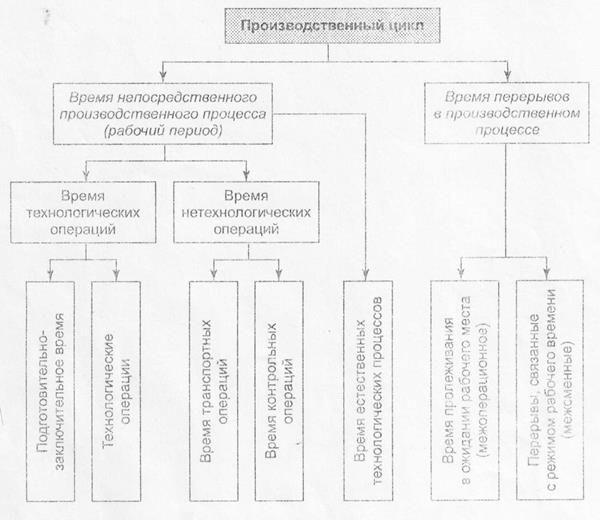 Из составляющих времени протекания процесса поризводства и времени перерывов в процессе производства и складывается производственный цикл: