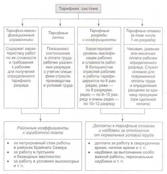 Тарифная система — совокупность норм и нормативов, обеспечивающих дифференциацию оплаты труда исходя из различий в сложности выполняемых работ и условий труда, его интенсивности и характера. Она состоит из следующих основных элементов: тарифно-квалификационные справочники; тарифные сетки; тарифные разряды и соответствующие им коэффициенты; тарифные ставки (в том числе 1-го разряда); районные коэффициенты к заработной плате, доплаты к тарифным ставкам и надбавки за отклонения от нормальных условий труда (рис. 1.).