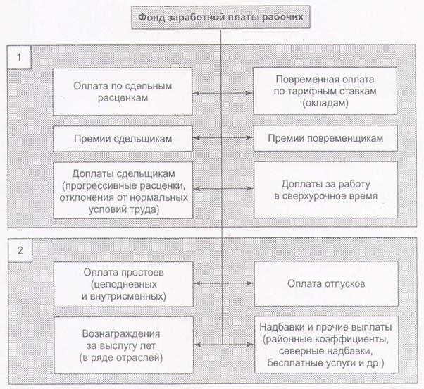 Рис. 3 – Состав фонда заработной платы рабочих: 1 – фонд прямой заработной платы; 2 – фонд дополнительной оплаты (за неотработанное время).