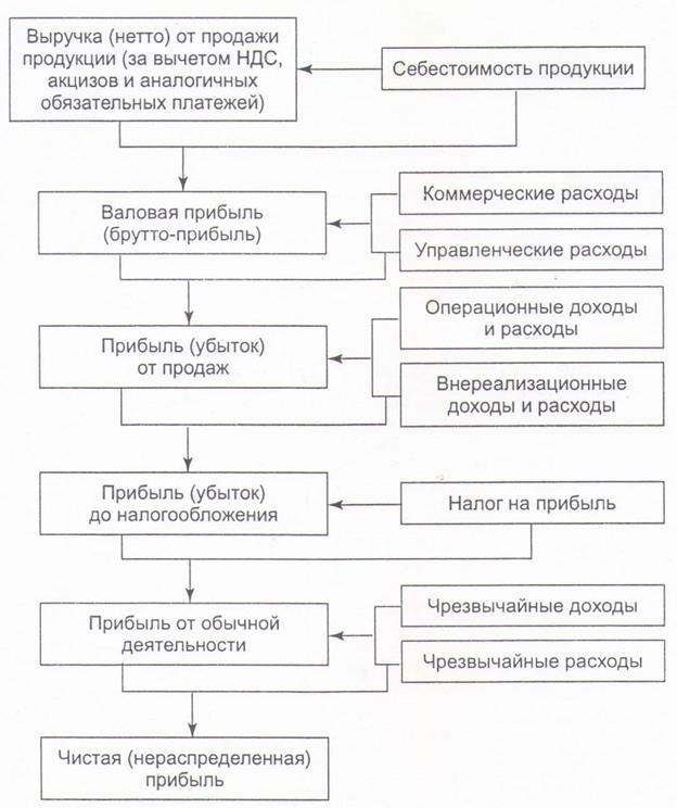 Прибыль (убыток) до налогообложения рассчитывается следующим образом: к прибыли от продаж прибавляются (вычитаются) сальдо операционных и внереализационных доходов и расходов. Прибыль от обычной деятельности определяется путем вычитания из прибыли до налогообложения налога на прибыль и иных аналогичных платежей. Чистая прибыль (нераспределенная прибыль), остающаяся в распоряжении предприятия, определяется с учетом сальдо чрезвычайных доходов и расходов.