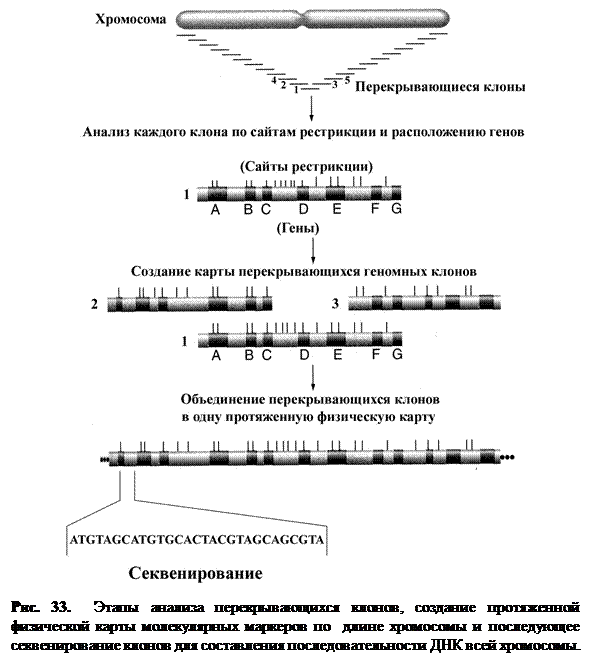Первым разработанным методом определения нуклеотидных последовательностей в генах, составляющих геном был метод «клон за клоном». На первом этапе создаются геномные (хромосомные) библиотеки фрагментов, которые покрывают всю геномную ДНК организма (геномные клоны). Извлеченные из библиотек клоны анализируют, чтобы создать генетические и физические карты на основе наследования генетических маркеров (RFLPs, STSs) в гетерозиготных семьях. После этого в клонах ищут перекрывающиеся друг с другом последовательности. Таким образом, перекрывают всю хромосому. На последнем этапе определяют нуклеотидную последовательность каждого клона, и, связывая их вместе, составляют последовательность ДНК всей хромосомы (генома). Основные этапы определения нуклеотидных последовательностей генома методом «клон за клоном» представлены на рис. 33.