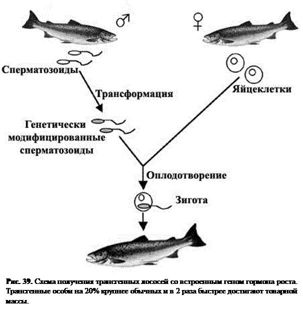 Получены также впечатляющие результаты на европейском лососе. Особи лосося (Salmo salmo) со встроенным геном ГР достигают товарного веса в 2 раза быстрее, чем обычные. Основные этапы получения трансгенных лососей представлены на рис. 39.