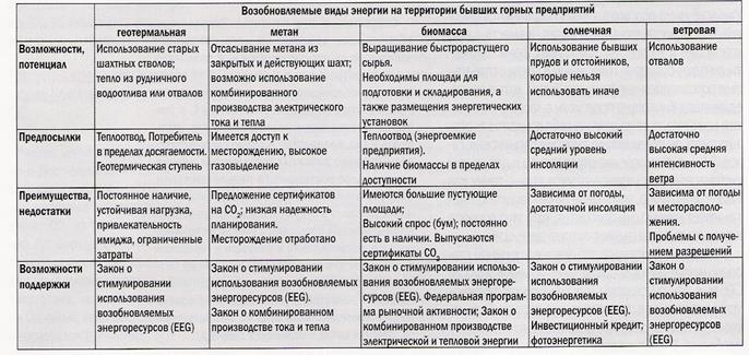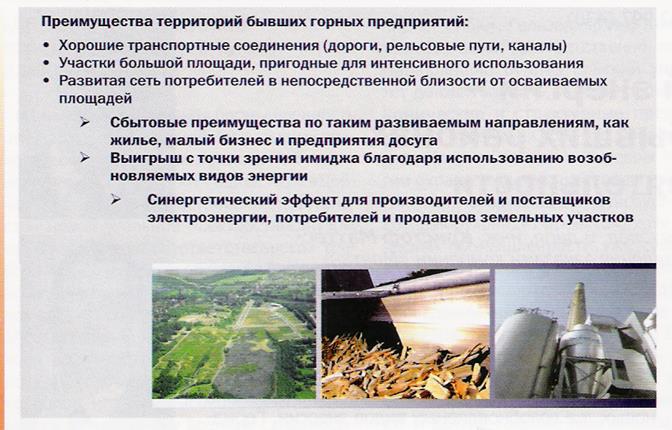 Бывшие горнопромышленные площади в Рурском и Саарском бассейнах, а также в других традиционных регионах угледобычи в Германии, должны стать интегральной частью этого развития. Такие классические направления развития, как промышленное производство, логистика или жилищная сфера отходят на второй план. Необходимо усилить внимание к вопросам иного использования этих площадей для освоения регенеративных видов энергии. Предпосылки для этого весьма благоприятны. Зачастую имеются в наличии хорошие транспортные соединения - дороги, рельсовые пути или каналы. Речь идет в большинстве случаев об участках большой площади, которые предназначаются для интенсивного использования, например, для выращивания биомассы. Потребительский потенциал находится при этом в непосредственной близости или может быть создан на месте. Жилые районы или районы развития малого бизнеса не в последнюю очередь за счет использования возобновляемой энергии получат заметные выгоды.