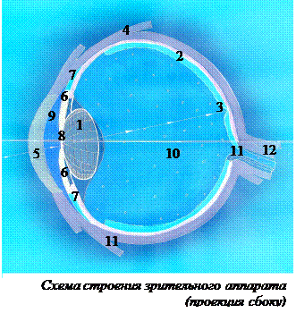 Между роговицей и радужкой располагается передняя камера (9) с водяной влагой. Стекловидное тело (10) заполняет внутреннюю полость задней камеры глазного яблока от хрусталика до сетчатки и придает ему объем.