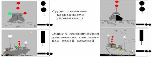 Теперь рассмотрим термин "на ходу" применительно к огням, знакам и туманным сигналам. Правило 35 (а) предписывает туманные сигналы для судна с механическим двигателем, имеющим ход относительно воды, а правило 35 (b) устанавливает другой сигнал для этого же судна в случае, когда оно в дрейфе. Правила части С устанавливают определенные огни и знаки для судов по характеру выполняемых ими операций как на ходу, так и при отсутствии хода относительно воды. Варианты возможных ситуаций показаны на рис.5 и рис.6.