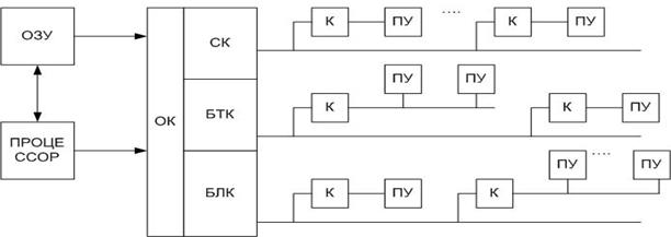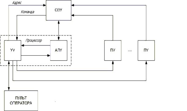 УУ и АЛУ – это Процессор. Каждое ПУ подключается непосредственно к ОЗУ и Процессору через нестандартные кабели связи. Управление работой этих ПУ осуществлялось специальными командами Процессора. Процессор принимал участие при выполнении всех операций ввода-вывода на всех ПУ. Такая организация ввода-вывода неэффективна, поскольку при выполнении операции ввода-вывода Процессор не может производить вычисления, т.е. выполнять свою программу.