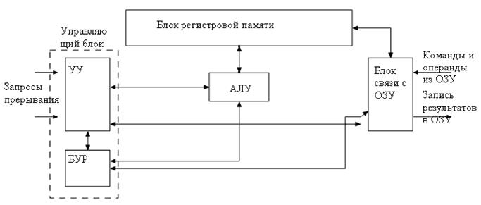 Упрощенная структурная схема процессора состоит из: арифметико-логического устройства(АЛУ), блока регистровой памяти, блока связи с ОЗУ, устройства управления (УУ) и блока управляющих регистров(БУР).