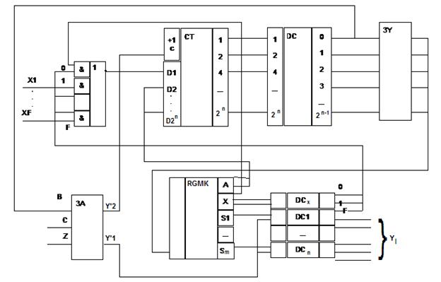 в счетчик адреса микрокоманд СТ записывается адрес следующей выполняемой МК. В целом управляющий автомат работает следующим образом: в счетчик СТ записывается нулевой начальный адрес и из ЗУ в регистр RGMK записывается первая МК. Подается сигнал запуска Z в ЗА. ЗА начинает формировать последовательность сигналов