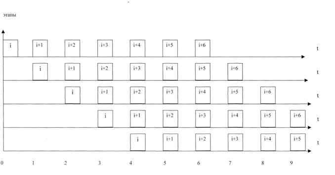 Синхронный конвейер целесообразно использовать при условии, что продолжительности ti примерно одинаковые и равны tт. Покажем принцип работы конвейерных команд на временной диаграмме.