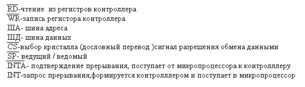 Если на вход контроллера поступает сигнал SP с отриц.=1, то в этом случае контроллер является ведущим, в противном случае ведомым. Когда контроллер ведомый, то микропроцессор загружает в его регистры специальную управляющую информацию. Когда контроллер ведущий, то он управляет процессом передачи данных.