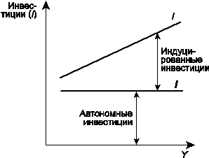 Следует различать автономные инвестиции, определяемые внешними факторами, их величина не зависит от национального дохода, и стимулируемые (производные, индуцированные) инвестиции, величина которых зависит от колебаний совокупного дохода (У).