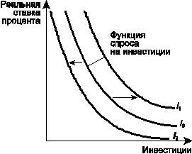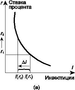 Инвестиционный спрос (I) - объем спроса инвесторов на заемные средства. Функция инвестиционного спроса отражает зависимость объема инвестиций от ставки процента (на рисунке ниже), которую инвестор сопоставляет с ожидаемой нормой прибыли. Кривая инвестиционного спроса показывает динамику объема инвестиций при изменении ставки процента.