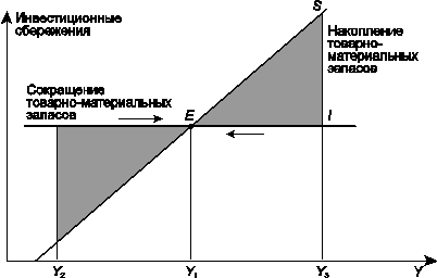 При объеме производства (У3), который больше равновесного выпуска (У), превышение уровня сбережений, ожидаемого производителями, означает сокращение потребления и как следствие — снижение фирмами производства (выпуска продукции) и накопление товарно-материальных запасов. Аналогично нестабильной будет и противоположная ситуация.