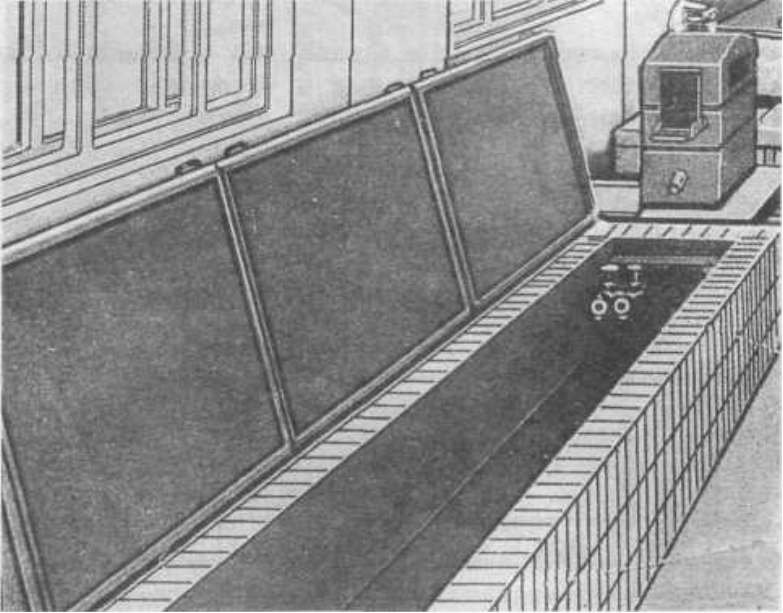 | 13. лебедка; 14. короб дляотвода воздуха; 15. шибер; 16. трос; 17. верхняя решетка; 18. ролик для подвески; 19. напорный рукав; 20. сушильная камера; 21. жалюзи; 22. короб для подвода воздуха; 23. шибер; 24. калорифер; водосток. |