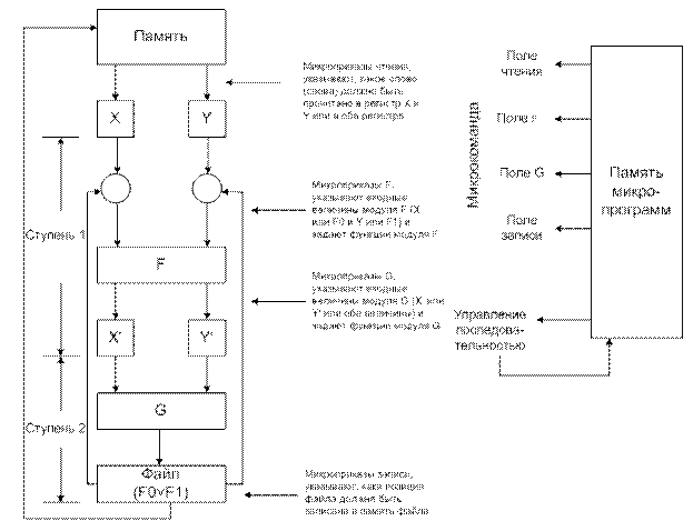 - поле G выбирает, что должен делать модуль G (сложить, вычислить или передать Х` неизменным), и куда поместить результат (в F0 или F1);