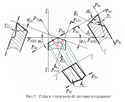 Статическая система – прямоугольная система координат с началом в рассматриваемой точке режущей кромки и ориентированная относительно направления вектора скорости главного движения (V). Применяется для приближенных расчетов углов инструмента и для учета их изменения при установке инструмента на станок.