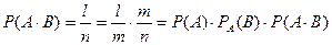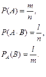 Пусть n-число всех возможных исходов опыта, в котором событие A наступает или не наступает, m-число исходов , благоприятствующих событию A, l- число событий благоприятствующих A×B, в котором событие A уже наступило.