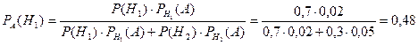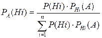 Пусть имеем полную группу гипотез Hi . Вероятность каждой из которых имеет определенное значение P(Hi). Допустим, что в результате опыта некоторое событие A, появление его может повлечь за собой изменение первоначальных вероятностей гипотез. Каковы бы не были вероятности гипотез Hi после опыта в предположении, что в результате опыта наступило событие A, сначала найдем условную вероятность первой гипотезы PA(H1).