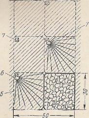 Вентиляционный сборочный орт 6проводят по центру блока, а из него —вентиляционные восстающие 7 под каждый штрек скреперования. Выработки горизонтовдоставки и вентиляционные крепят металлической податливой крепью. Для разбуривания массива глубокими скважинами по углам блока располагают буровые 8 и ходовые 9 восстающие, а из них через 4—5 проводят буровые ниши 10. Первую нишу засекают на величину л. н. с. (в 4—5 от кровли подсечки). Глубокие скважины располагают веерообразно.