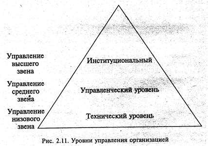 Под уровнем управления понимают совокупность звеньев управления, занимающих определенную ступень в системах управления организацией. Ступени управления находятся в вертикальной зависимости и подчиняются друг другу по иерархии: менеджеры более высокой ступени управления принимают решения, которые конкретизируются и доводятся до нижестоящих звеньев. Пирамидальная структура управления организацией показана на рис. 2.11.