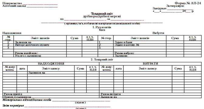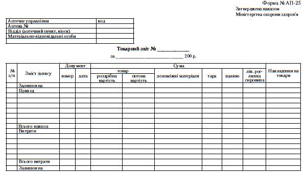 Основним документом управлінського обліку в аптеках є звіт про фінансово-господарську діяльність (місячний звіт),