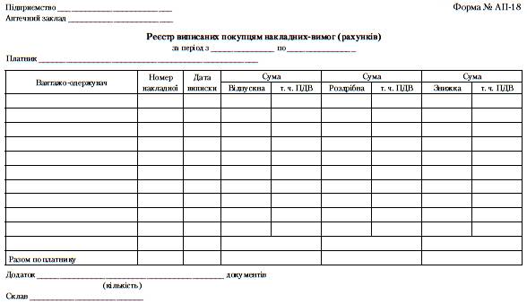 • VII розділ - Реєстр виписаних покупцям (лікувальним закладам та іншим установам) рахунків-фактур на відпущені з аптеки товари-,