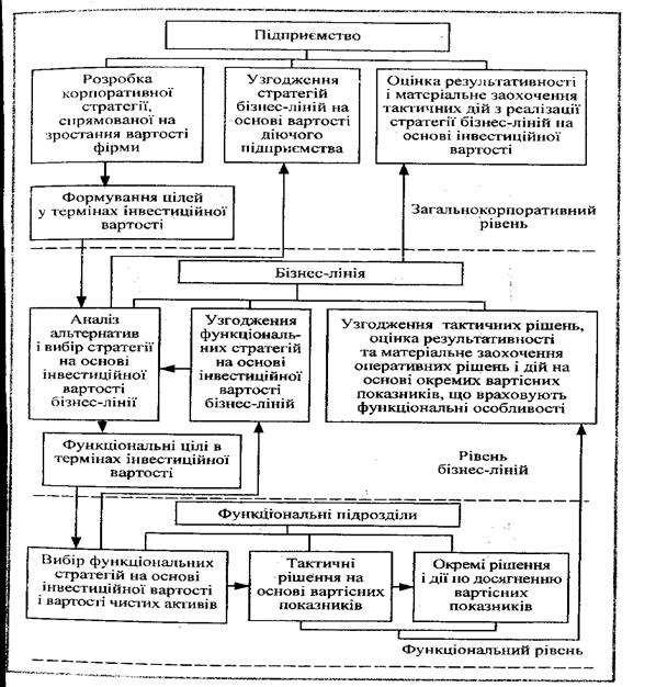 Управління вартістю на кожному рівні має бути взаємоузгодженим, при цьому тактичні та оперативні дії з реалізації стратегічних рішень контролюються та оцінюються на вищих рівнях управління, а персонал мотивується, виходячи з досягнутих значень інвестиційної вартості (для бізнес-лінії) та вартісних показників, що враховують функціональні особливості (для підрозділів підприємства).