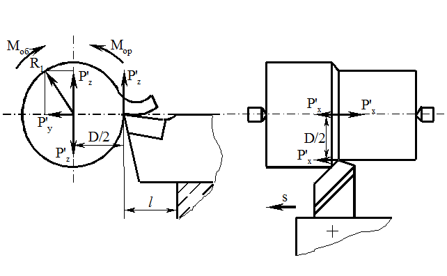 Сила Py' згинає заготовку в горизонтальній площині. При недостатній жорсткості системи ВПІД ця сила може визвати вібрації. Py', складаючись з силою Pz', утворюють силу R1, яка може створювати сумарний, що згинає, який діє на заготовку і впливає на точність обробленої поверхні.