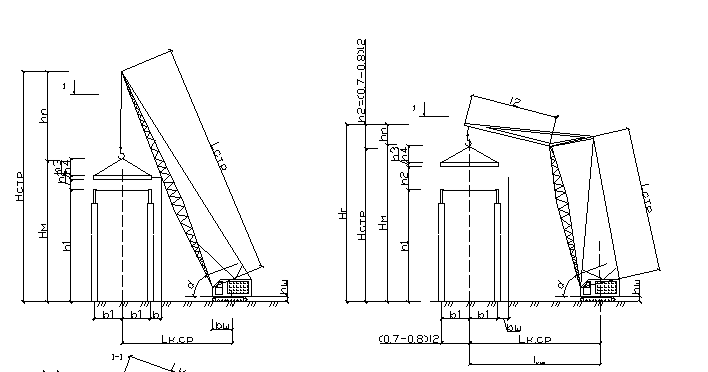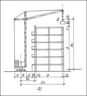 а – потрібна вантажність, т; Qм – максимальна маса елемента, що монтується, т; Qт – маса такелажного оснащення, т; Нк – потрібна висота підйому гака, м; h – висота будівлі, м; С - 0,5м (відстань від низу елемента, що монтується до рівня останнього монтажного горизонту); h1 – максимальна висота елемента, що монтується, м; h2 – висота оснастки (стропування), м; Lк – необхідний виліт гака, м; R – радіус повороту крана з поворотною платформою, м; а – безпечна зона між поворотною частиною крана і конструкціями будівлі, що дорівнює 0,7м для баштових кранів і 1,0м для стрілових; l1 – довжина конструкцій будівлі, що виступають за площину стіни, м; l2 – відстань від осі будівлі до зовнішньої площини стіни, м; В – ширина будівлі, м; α – кут нахилу стріли крана (15о…75о).