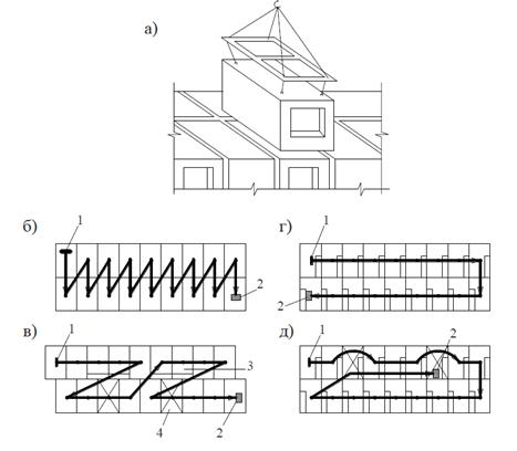 Рис. 3.23 - Монтаж будинків з об'ємних блоків: а - загальний вигляд монтажу; б - послідовність монтажу будинку із об'ємних блоків без зовнішніх комунікацій; в - із зовнішніми комунікаціями на торцевій грані; г - те ж, на поздовжній; д - те ж, на торцевій та поздовжній гранях; 1 -початок монтажу; 2 - кінець монтажу; 3 - блоки з зовнішніми комунікаціями; 4 - блоки сходової клітини