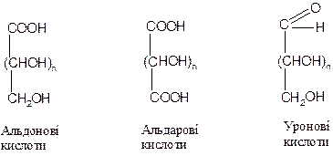 Моносахариди легко окиснюються. Залежно від умов утворюються різні продукти — -онові, -арові, -уронові кислоти.