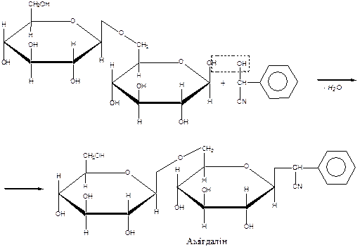 Утворення глікозидів. Представником глікозидів є амігдалін, який міститься в зернах гіркого мигдалю, кісточках персиків, абрикосів, слив, вишень, яблук, груш, листі лавровишні та інше. Під дією кислот або ферменту емульсину, амігдалін розкладається на дві молекули глюкози, молекулу бензойного альдегіду і синильної кислоти.