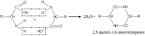 -амінокислот відбувається із міжмолекулярним відщепленням води і утворенням циклічних амідів — дикетопіперазинів: