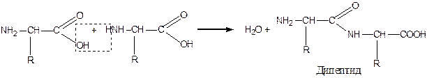 -амінокислоти реагують одна з одною за рахунок аміно- і карбоксильної групи з утворенням відкритого ланцюгу (утворення пептидів):