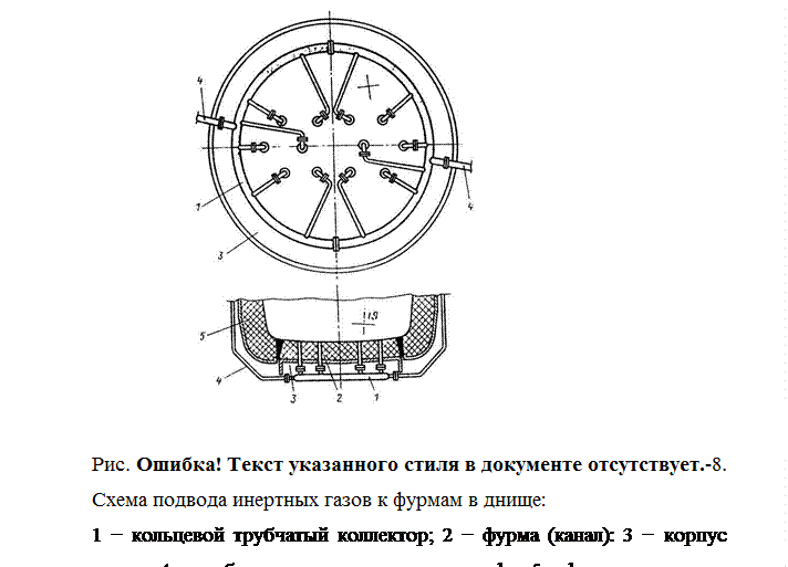 Наиболее широкое применение получила продувка кислородом сверху и нейтральным газом (Ar, N2) снизу, которые подают либо через одиночные фурмы (от 4 до 10 штук) или многоканальные огнеупорные блоки. Один из вариантов подвода инертных газов к фурмам в днище (рис.8.2‑8).