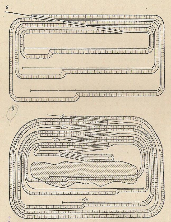 Если протяженность трассы превосходит длину борта карьера, то возможны случаи, показанные на рис. 168, 6, в, г: 1) трассу размещают на одном борту карьера, ее простые отрезки разного направления соединяют тупиками (при железнодорожном транспорте) или петлями минимально допустимого радиуса (при автомобильном транспорте); 2) трассу переводят с одного борта на другой до полного размещения ее на всю глубину карьера, при этом трасса приобретает спиральную форму.