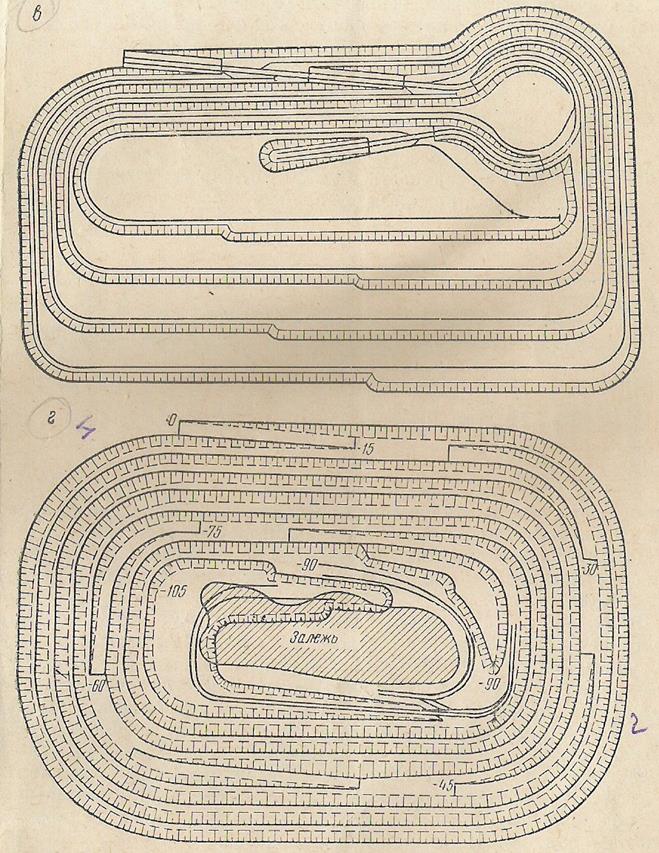 Траншеи, примыкающие к рабочим горизонтам на руководящем подъеме, отличаются наименьшей длиной и объемом. Смягчение встречается лишь в местах укладки стрелочных переводов и на кривых. При таком профиле траншей мощность локомотива должна быть больше, так как трогание поезда м'ожет происходить и на руководящем подъеме.