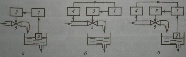 Замкнутые системы используют текущую информацию о выходных величинах, определяют отклонение е(t) управляемой величины Y(t) от ее заданного значения Ко и принимают действия к уменьшению или полному исключению е(t). Простейшим примером замкнутой системы, называемой системой регулирования по отклонению, служит показанная на рисунке 1.3, а система стабилизации уровня воды в баке. Система состоит из измерительного преобразователя (датчика) 2 уровня, устройства 1 управления (регулятора) и исполнительного механизма 3, управляющего положением регулирующего органа (клапана) 5.