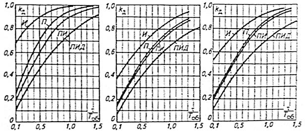 На номограммах представлены И-, П-, ПИ- и ПИД-регуляторы. С увеличением инерционности объекта, характеризуемой отношением