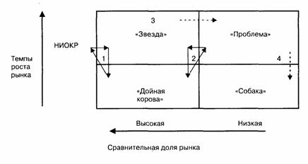 Новые продукты чаще появляются в растущих отраслях и имеют статус «товара-проблемы». Такие продукты могут оказаться очень перспективными, но они нуждаются в существенной финансовой поддержке центра. Пока эти продукты ассоциируются с большими отрицательными финансовыми потоками, остается опасность, что они не смогут стать товарами-«звездами». Главный стратегический вопрос, представляющий известную сложность, — когда прекратить финансирование этих продуктов и исключить их из корпоративного портфеля? Если это сделать слишком рано, то можно потерять потенциальный товар-«звезду». В категорию товаров-«звезд» могут попасть как новые продукты, так и новые товарные марки продукции предприятия. Риск финансовых вложений в эту группу наиболее велик.