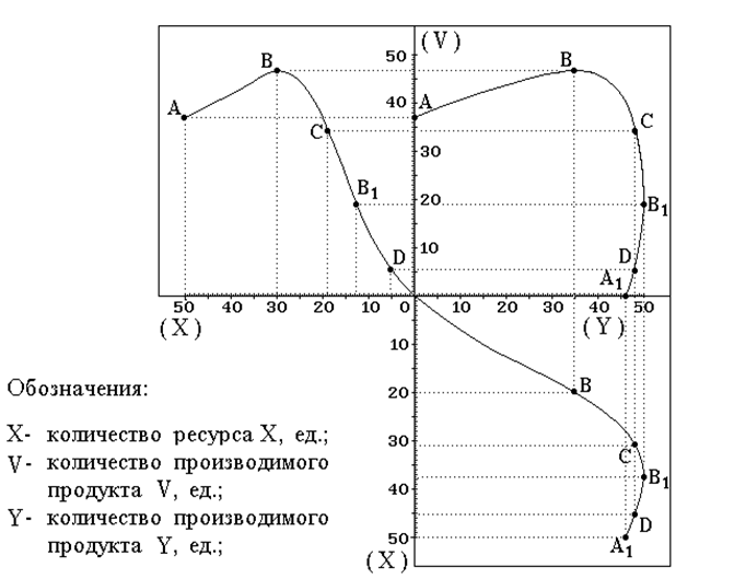 Допустим, имеются функции зависимости выпуска различных продуктов Y и V от одного и того же ресурса Х: