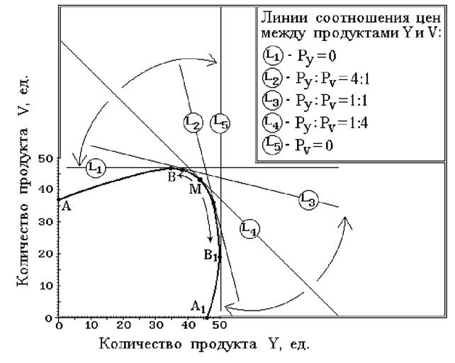 Линия L1 проведена для случая снижения цены продукта Y до нуля, когда производить этот продукт нецелесообразно. Линия L2 отражает ситуацию, когда цена продукта Y в четыре раза ниже цены продукта V. L3 - линия равенства цен обоих продуктов (1:1). Линия L4 показывает случай, когда цена продукта Y в четыре раза выше цены продукта V. Последняя линия L5 соотношения цен проведена при цене продукта Pv = 0.