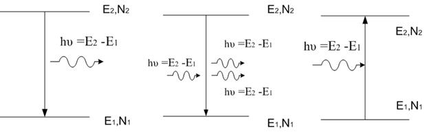 N1 и N2 в [1/м3] – число частиц в единице объёма находящихся на энергетических уровнях Е1 и Е2 в возбужденном и невозбужденном состоянии соответственно; Е1 и Е2 – внутренняя энергия в ДЖ, ЭВ или в см-1