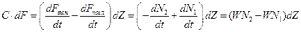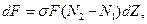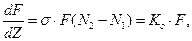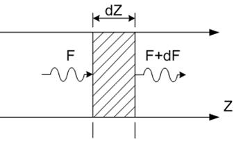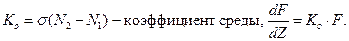 Предположим, что в веществе имеются два энергетических уровня E2 и E1 атомов с населенностями N2 и N1 соответственно. В веществе по оси Z распространяется поток фотонов плотностью F. Изменение плотности потока в слое dZ вследствие поглощения и вынужденного излучения определится с использованием формул (2.5) и (2.7) следующим образом: